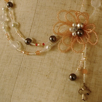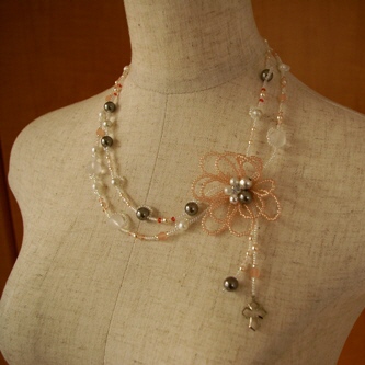 大小のパールがランダムに並ぶ2連のチェーン、 胸元に咲く一輪の花からフリンジが下がります。 優しい色合いで華を添えます。 |
