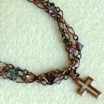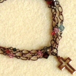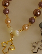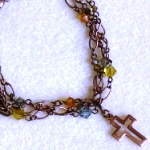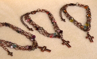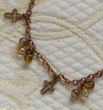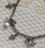 スワロの3連ブレスレット 2色 各1470円 長さ*18cm(アジャスター付) 古美銅の落ち着いたチェーンの中に、 大小のシックなトーンのスワロがキラリ。 アジャスターの先にも小さなクロスが揺れています。 (お揃いのネックレスへ) |