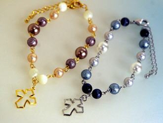パールとチェコのブレスレット 4色 各1575円 長さ*20cm(アジャスター付) 12ミリの大きめパールと 大人色のチェコFPのハーモニー。 (お揃いのネックレスへ) |