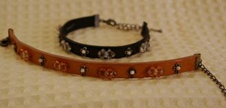 革のブレスレット 2色 各1890円 長さ*18cm(アジャスター付) 10ミリ幅の平革に、スワロとクロスを縫いつけました。 |