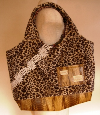 No.B06-2 後面内部 前面外部 素材:アニマルプリント起毛(外)、綿プリント(中)、 合成皮革(外下部)、ケミカルレース、他 |